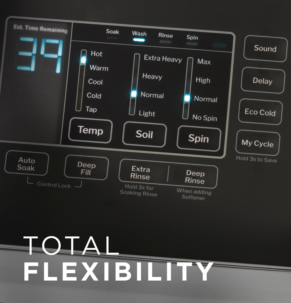 Wash without compromise in cold water. When selected Eco Cold adjusts wash action to achieve a great clean while saving up to 90% on energy costs. Energy savings using cold water vs. hot water for the normal cycle with a max load using the DOE test procedure to measure machine and hot water energy.